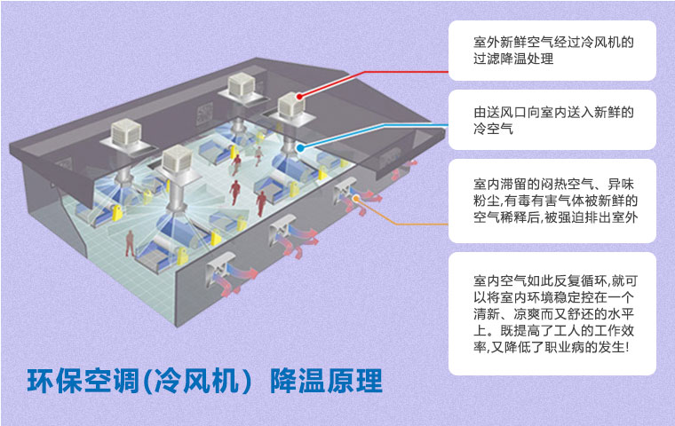 在空氣不流通的環(huán)境中,尤其是化工車間,容易產(chǎn)生建筑綜合癥,如悶熱、頭疼、眩暈、過敏、咳嗽等不適癥狀。使用環(huán)??照{(diào)(冷風(fēng)機(jī))通風(fēng)降溫方案即可以有效降溫,又能保證空氣流通